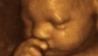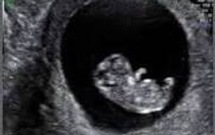 This ultrasound scan shows a little figure that looks something like an oblong bean. Eyes on the face and eyelids have formed. Limb buds are visible. Looks more like a human.